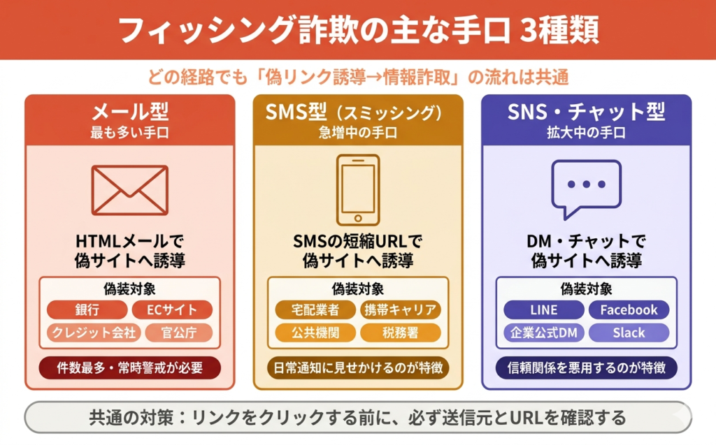 現在確認されているフィッシング詐欺の手口は、主に以下の3種類に分類できます。