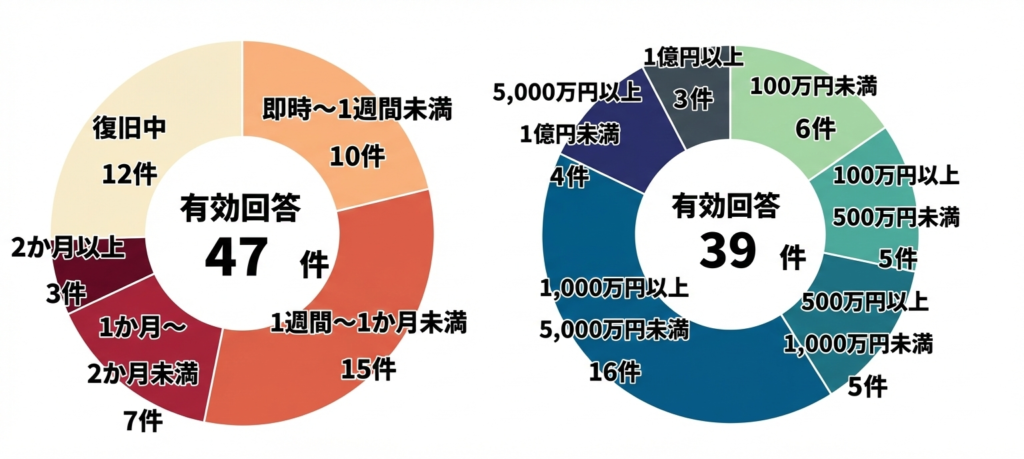 復旧までにかかった期間は1週間から1ヵ月、被害金額は1,000万円から5,000万円が割合としては高いです。